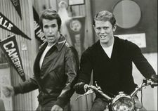 Richie (Ron Howard) takes a turn on Fonzie's motorcycle in a scene from Happy Days