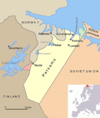 خريطة تاريخية لمنطقة پتسامو. المنطقة الخضراء هي الجزء الفنلندي من شبه جزيرة ريباتشي (Kalastajasaarento) الذي تنازلت عنه للاتحاد السوڤيتي بعد حرب الشتاء.