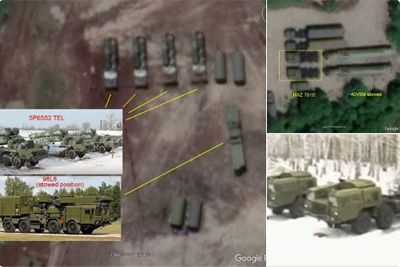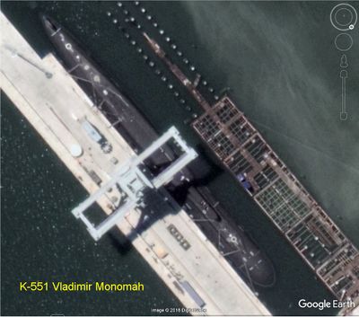 التصوير بدقة عالية يظهر قاعدة الغواصات في ريباتشي. ويمكن تبين رادار 96L6 في وضع التخزين على MZKT-7930. كما يمكن عد محاور شاحنة MAZ-7910 لجر معدات صارية 40V6M المخزنة. المصدر: تويتر