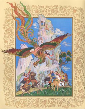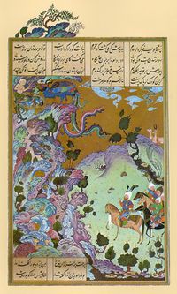 ان زال ولد وشعره أبيض فاستقبحه وأمر بتركه وحيداً في جبل البرز. فكانت تربيه سيمرغ العنقاء مع أولادها حتى طالت عليه المدّة في قلة ذلك الجبل. ورأى سام أيضا في منامه ليلة كأن رسولا جاء على فرس فأعلمه أن ولده زال على بعض الجبال فانتبه وأحضر الحكماء والمعبرين وسألهم عن حال رؤياه. وجاء سام إلي ذلك الجبل وسأل سيمرغ ان يرد عليه زال. وأحملته سيمرغ بين جناحيها إلى أبيه سام. واعطته سيمرغ من جناحها ريشة؛ فقالت له إنها ستحضر في يحرقها زال وتقضى حاجته.