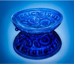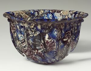 The earliest Roman glass follows Hellenistic traditions and uses strongly coloured and 'mosaic' patterned glass. During the late Republican period new highly coloured striped wares with a fusion of dozens of monochrome and lace-work strips were introduced.[2] During this period there is some evidence that styles of glass varied geographically, with the translucent coloured fine wares of the early 1st century notably 'western' in origin, whilst the later colourless fine wares are more 'international'.[7] These objects also represent the first with a distinctly Roman style unrelated to the Hellenistic casting traditions on which they are based, and are characterised by novel rich colours.[2] 'Emerald' green, dark or cobalt blue, a deep blue-green and Persian or 'peacock' blue are most commonly associated with this period, and other colours are very rare.[7] Of these, Emerald green and peacock blue were new colours introduced by the Romano-Italian industry and almost exclusively associated with the production of fine wares.[7]