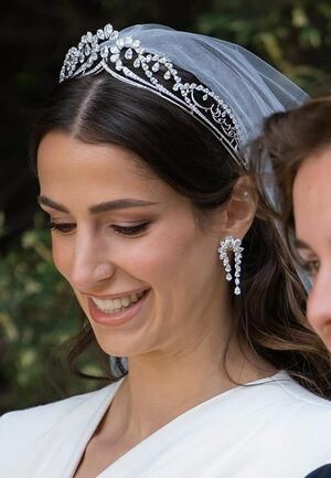 تاج العروس صنع خصيصًا للأميرة رجوة مكتوب عليه عبارة "رجوة من الله"كما لفتت الأميرة رجوة الأنظار فى حفل زفافها على الأمير الحسين بفستان رقيق أبيض بسيط يحمل تفاصيل وقصات مميزة.