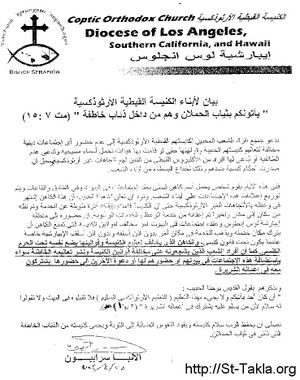 ندعو جميع أفراد الشعب المحبين لكنيستهم القبطية الأرثوذكسية إلى عدم حضور أي إجتماعات دينية مخالفة لتعاليم كنيستهم الحبيبة وقوانينها، حتى لو قامت بها هيئات تحمل أسماء مسيحية تدعي عدم الطائفية، أو يدعي لها أفراد من الإكليروس القبطي من الذين لهم إتجاهات غير أرثوذكسية، وسبق أن صدرت أحكام كنسية ضدهم ولذلك لخداع البسطاء من أبناء الشعب. ففي هذه الأيام يقوم شخص يحمل إسم كاهن قبطي بعقد إجتماعات في البيوت وفي الفنادق والقاعات، ويتم توزيع إعلانات هذه الإجتماعات على أبناء الشعب. ونود أن نعلن لشعبنا الحبيب أن هذا الكاهن إشتهر في وعظه بالإتجاهات الغير أرثوذكسية حتى أن قامت الكنيسة بوقفه فترة طويلة عن الخدمة، وتم نقله من مكان إلى مكان. وأخيراً تم إعفاءه من خدمة الوعظ والخدمات الرعوية. إن حضورة إلى منطقة ايبارشية لوس انجلوس وعقد إجتماعات في البيوت أمر مخالف لقوانين الكنيسة التي تمنع الكاهن أن يترك مكان خدمته ويذهب للخدمة في مكان آخر بدون إذن أسقفه وبدون اذن أسقف الإيبارشية خاصة عندما يكون تحت قانون كنسي. والكاهن الذي يخالف تعاليم الكنيسة وقوانينها يضع نفسه تحت دائرة الحرم الكنسي. كما أن أفراد الشعب الذين يشجعونه على مخالفة قوانين الكنيسة ونشر تعاليمه الخاطئة سواء بإستضافة هذه الإجتماعات في بيوتهم أو حضورهم لها أو دعوة الآخرين إلى حضورها يشتركون معه في أعماله الشريرة. ونذكرهم بقول القديس يوحنا الحبيب: "ان كان احد يأتيكم ولا يجيء بهذا التعليم فلا تقبلوه في البيت ولا تقولوا له سلام، لأن من يسلم عليه يشترك في أعماله الشريرة" (2يو10:1). نصلي أن يحفظ الرب سلام كنيسته ويقود النفوس الضالة إلى التوبة، ويحمي كنيسته من الذئاب الخاطفة التي تأتي في ثياب الحملان. الأنبا سرابيون 28/4/2003. انتهى البيان