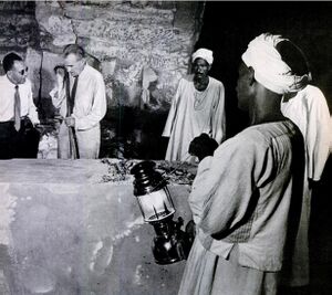 الدكتور زكريا غنيم مُكتشف هرم أوناس المدرج ومقبرته وهنا يشرح التابوت المنحوت من المرمر لجفرسون كافري سفير الولايات المتحدة.