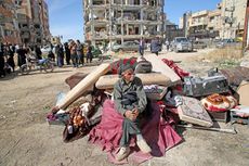 إيراني يجلس بجوار منقولاته بعد تهدم منزله في كرمانشاه، بعد زلزال 2018.