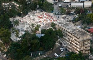 فندق كريستوفر الذي يشمل جزء منه مقر الأمم المتحدة في بور أو برنس والذي انهار جراء الزلزال.