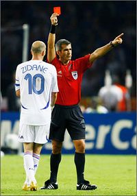 في الدقيقة 110 في الشوط الثاني الاضافي من زمن المباراة النهائية في كأس العالم 2006 بين منتخب فرنسا ومنتخب إيطاليا، حصل زيدان على بطاقة حمراء بعد أن قام بنطح المدافع الإيطالي ماركو ماتيراتزي، وقد تبادل اللاعبين قبل حصول الحادثة ببضعة ثواني بعض الكلمات الجارحة، وبدأ المشادة عندما سحب ماتيراتزي قميص زيدان، فحاول زيدان أن يستفز ماتيراتزي فقال له: لا تقلق سأعطيك القميص بعد نهاية المباراة، فقام ماتيراتزي بالرد عليه وقال: لا أريد القميص بل أريد أختك...، فتراجع زيدان، وسدد ضربة برأسه على صدر ماتيراتزي أوقعته أرضا، ولكن الحكم هوراسيو أليزوندو لم ير الواقعة، فأخبره الحكم الرابع لويس ميدينا كونتاليخو بالحادثة، فأشهر الحكم البطاقة الحمراء في وجه زيدان.