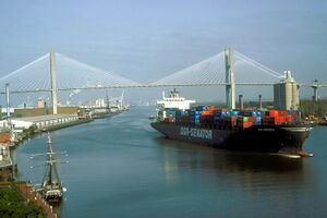 Savannah lies on the Savannah River, approximately 20 mi (32 km) upriver from the Atlantic Ocean.[20] According to the United States Census Bureau (2011), the city has a total area of 108.7 ميل مربع (281.5 km2), of which 103.1 ميل مربع (267.0 km2) is land and 5.6 ميل مربع (15 km2) is water (5.15%). Savannah is the primary port on the Savannah River and the largest port in Georgia. It is also near the U.S. Intracoastal Waterway. Georgia's Ogeechee River flows toward the Atlantic Ocean some 16 ميل (26 km) south of downtown Savannah and forms the southern city limit.