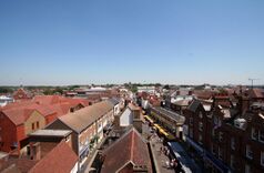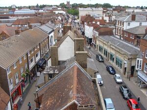 St Albans viewed from the Clock Tower: French Row (to the left), Market Place (to the right), St Peter's Street and the tower of St Peter's Church (centre)