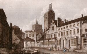 St Albans High Street in 1807, showing the shutter telegraph on top of the city's Clock Tower
