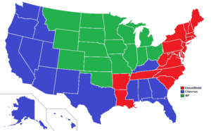 This map shows which state currently has the rights to the Standard Oil name belonging to. إكسون موبيل has full international rights and continues to use the Esso name overseas. كنتكي is currently held by Chevron, however its status is up in the air after Chevron withdrew retail sales from Kentucky in July 2010.