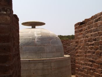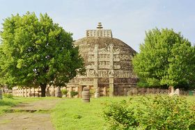 Stupas originated as pre-Buddhist tumuli in which śramaṇas were buried in a seated position[3] called chaitya.[4] After the parinirvana of the Buddha, his remains were cremated and the ashes divided and buried under eight mounds with two further mounds encasing the urn and the embers. The earliest archaeological evidence for the presence of Buddhist stupas dates to the late 4th century BCE in India. Buddhist scriptures claim that stupas were built at least a century earlier. Since it is likely that before this time stupas were built with non-durable materials such as wood, or that they were merely burial mounds, little is known about them, particularly since it has not been possible to identify the original ten monuments. However, some later stupas, such as at Sarnath and Sanchi, seem to be embellishments of earlier mounds. The earliest evidence of monastic stupas dates back to the 2nd century BCE. These are stupas that were built within Buddhist monastic complexes and they replicate in stone older stupas made of baked bricks and timber. Sanchi, Sarnath, Amaravati and Bharhut are examples of stupas that were shaped in stone imitating previously existing wooden parts.