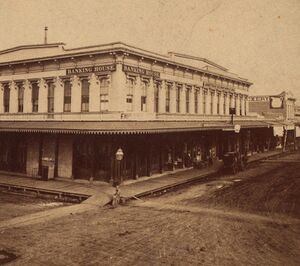 As the head of navigation on the San Joaquin River, the city grew rapidly as a miners' supply point during the Gold Rush. Weber built the first permanent residence in the San Joaquin Valley on a piece of land now known as Weber Point.[23] During the Gold Rush, the location of what is now Stockton developed as a river port, the hub of roads to the gold settlements in the San Joaquin Valley and northern terminus of the Stockton - Los Angeles Road. During its early years, Stockton was known by several names, including "Weberville," "Fat City," "Mudville" and "California's Sunrise Seaport."[2] In 1849 Weber laid out a town, which he named "Tuleburg," but he soon decided on "Stockton" in honor of Commodore Robert F. Stockton. Stockton was the first community in California to have a name that was neither Spanish nor Native American in origin.[1]