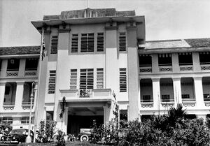 A delegation was selected to go to the Japanese headquarters. It consisted of a senior staff officer, the colonial secretary and an interpreter. The three set off in a motor car bearing a Union Jack and a white flag of truce toward the enemy lines to discuss a cessation of hostilities.[142] They returned with orders that Percival himself proceed with staff officers to the Ford Motor Factory, where Yamashita would lay down the terms of surrender. A further requirement was that the Japanese Rising Sun Flag be hoisted over the Cathay Building, the tallest building in Singapore.[143] Percival formally surrendered shortly after 17:15.[121] Earlier that day, Percival had issued orders to destroy all secret and technical equipment, ciphers, codes, secret documents and heavy guns.[144]