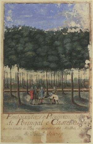 توقيع معاهدة أوترخت بين البرتغال وإسبانيا، في 6 فبراير 1715. من اليسار إلى اليمين: دوق أوسونا، بالمعطف الأحمر، لويس دا كونيا، بالمعطف الأسود، الأمناء، بالمعاطف الزرقاء والصفراء، وكونت تاروكا، جاثم، بمعطف بني.