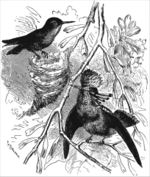 رسم من أصل الإنسان واختيار العلاقةالجنسية لتشارلز داروين يظهر فيه طائر Tufted Coquette Lophornis ornatus، الأنثى إلى اليسار، والذكر ذو الريش الملون إلى اليمين.
