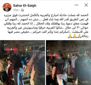 الحمد لله عملت حادثة إمبارح والعربية بالكامل اتحشرت فوق جزيرة في نص الطريق قدر الله وما شاء فعل مش ده المهم، والمهم أني فهمت معني دعوة ربنا يوقفلك ولاد الحلال، أنا الحمد لله ربنا وقفلي حوالي 30 ابن حلال.. شالوا العربية حرفيًا وماسبونيش غير والعربية علي الأسفلت.. أشكركم جدًا وكتر ألف خيركم.. حقيقي مصر فيها رجالة[3].