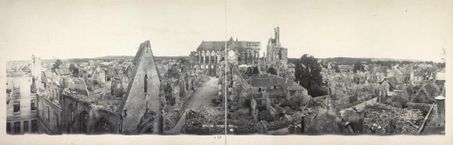During World War I, the city came under heavy bombardment. There was mutiny after the disastrous Chemin des Dames offensive at the Second Battle of the Aisne. A statue erected with images of French soldiers killed in action in 1917 is behind the St Peter's Church, next to the Soissons Courthouse.