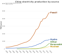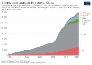 Coal remains the foundation of the Chinese energy system, covering close to 70 percent of the country's primary energy needs and representing 80 percent of the fuel used in electricity generation.[25] China produces and consumes more coal than any other country. Analysis in 2016 shows that China's coal consumption appears to have peaked in 2014.[26][27] According to Global Energy Monitor, China's government has limited the hours of 40% of coal-fired power stations built in 2019, due to overcapacity in electricity generation.[28]