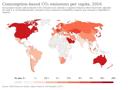 Consumption-based CO2 emission per capita per year per country (2016 data)
