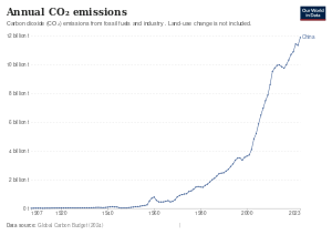 In 2002, China ranked 2nd (after the United States) in the list of countries by carbon dioxide emissions, with emissions of 3.3 billion metric tons, representing 14.5% of the world total.[8] In 2006, China overtook the US, producing 8% more emissions than the US to become the world's largest emitter of CO2 emissions.[9] However per capita China was ranked 51st in CO2 emissions per capita in 2016, with emissions of 7.2 tonnes per person (compared to 15.5 tonnes per person in the United States).[10] In addition, it has been estimated that around a third of China's carbon emissions in 2005 were due to manufacturing exported goods.[11]