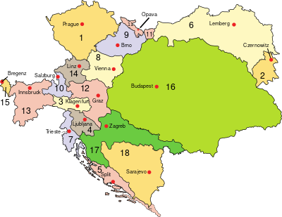 Cisleithania (Empire of Austria): 1. Bohemia, 2. Bukovina, 3. Carinthia, 4. Carniola, 5. Dalmatia, 6. Galicia, 7. Austrian Littoral, 8. Lower Austria, 9. Moravia, 10. Salzburg, 11. Silesia, 12. Styria, 13. Tyrol, 14. Upper Austria, 15. Vorarlberg;