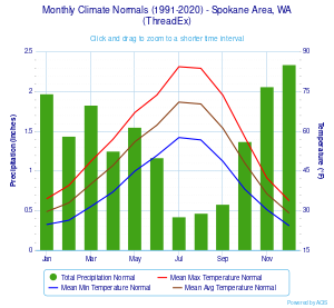 Spokane's location, between the Cascades Range to the west and the Rocky Mountains to the east and north, protects it from weather patterns experienced in other parts of the Pacific Northwest. The Cascade Mountains form a barrier to the eastward flow of moist and relatively mild air from the Pacific Ocean in winter and cool air in summer.[118] As a result of the rain shadow effect of the Cascades, the Spokane area has 16.5 بوصات (420 mm) average annual precipitation, less than half of Seattle's 39.3 بوصات (1،000 mm).[119] Precipitation peaks in December, and summer is the driest time of the year. The Rockies shield Spokane from some of the winter season's coldest air masses traveling southward across Canada.[118] In the summer season, Spokane, like much of the western United States, has been experiencing more frequent and larger wildfire events since the late 20th century; the fine particulate matter in the smoke can be carried by the wind and blanket the region in a haze and impact Spokane's air quality.[120]