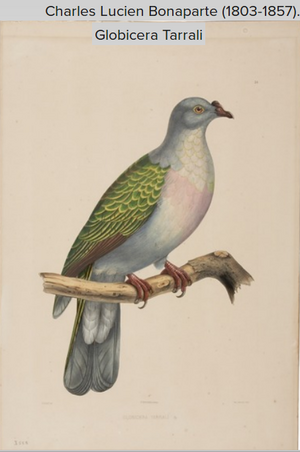 At the end of 1826, Bonaparte and his family returned to Europe. He visited Germany, where he met Philipp Jakob Cretzschmar, and England, where he met John Edward Gray at the British Museum, and renewed his acquaintance with Audubon. In 1828, the family settled in Rome. In Italy, he was the originator of several scientific congresses, and lectured and wrote extensively on American and European ornithology and other branches of natural history.[2] Between 1832 and 1841, Bonaparte published his work on the animals of Italy, Iconografia della Fauna Italica. He had also published Specchio Comparativo delle Ornithologie di Roma e di Filadelfia (Pisa, 1827), presenting a comparison between birds of the latitude of Philadelphia and Italian species.[2] He created the genus Zenaida, after his wife, for the mourning dove and its relatives. He was elected a member of the American Antiquarian Society in 1845.[5]