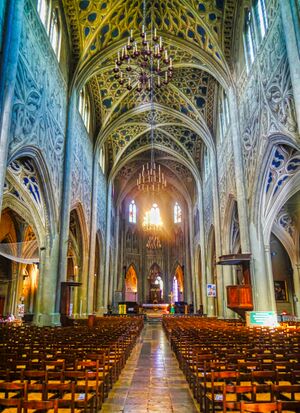 The cathedral of Saint Francis of Sales in Chambéry presents one of the best examples of Savoyard trompe-l’oeil paintings and the largest in Europe. It also houses an organ listed as a historic monument, as well as an identical replica of the Holy Shroud gifted by the Archbishop of Turin.[7] The original had resided in the ducal chapel in Chambéry between 1466 and 1578.