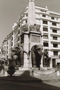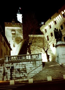 The Fontaine des Éléphants ("Elephants Fountain") is surely the most famous landmark in Chambéry. It was built in 1838 to honour Benoît de Boigne's feats when he was in الهند. This statue, which represents the forelimbs of four elephants truncated in a column in the shape of the savoyan (savoyarde) cross was first hooted by the inhabitants, annoyed to see elephants in their city, but it appears that now, most of them have accepted. Witness of the previous dislike, the statue kept its nickname of les quatre sans culs, ("the four without arse(s)" sounding almost like the title of the best-known movie of the most prominent nouvelle vague director François Truffaut : "Les quatre-cent coups"/The 400 Blows).