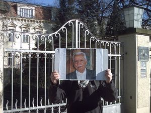 برلين، فبراير 2014: طالب بعثي أمام السفارة اللبنانية يُذكـِّر باختفاء العيسمي