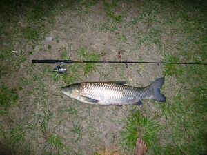 The grass carp (Ctenopharyngodon idella), and black carp (Mylopharyngodon piceus) as well as common carp (Cyprinus carpio) are popular targets for recreational fisherman in the Midwest, despite their status of being an invasive species. These species are unique because of their ability to be caught with the traditional fishing technique of using a fishing rod, reel and a hook.[9] Other invasive carp species – the Silver carp (Hypophthalmichthys molitrix) and bighead carp (Hypophthalmichthys nobilis) are not traditionally caught on rod and reel because they feed on plankton, therefore they do not bite on baited hooks or lures.[10]