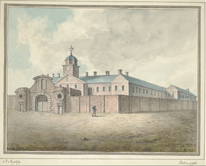 Prince Rupert established his headquarters in the town on 18 February 1644, being welcomed by Shrewsbury's aldermen. He was billeted in a building then the home of the family of Thomas Jones[75] in the precincts of what is now the Prince Rupert Hotel.[76] Shrewsbury only fell to Parliament forces after they were let in by a parliamentarian sympathiser at the St Mary's Water Gate (now also known as Traitor's Gate).[77] After Thomas Mytton captured Shrewsbury in February 1645; in following with the ordnance of no quarter; a dozen Irish prisoners were selected to be killed after picking lots.[78][79] This prompted Rupert to respond by executing Parliamentarian prisoners in Oswestry.[80]