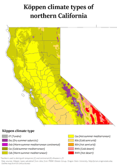 Northern California has warm or mild to cold climate, in which the Sierra gets snow in the late fall through winter and occasionally into spring. Summers are mild along the coast and generally warm and dry, while winters are cool and usually wet. The high temperatures range from 50s to 30s in the winters while summers temperature range is 90s to 60s or 50s, with highs well into the 100s for the Sacramento region. Snow covers the mountains (generally above 3000 feet) in mid January through February. Fog occurs infrequently or occurs normally in the west and coast, especially in the summer, creating some of the coolest summer conditions in North America.[بحاجة لمصدر]