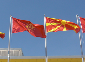 Vergina Sun flag and new flag of the Republic of Macedonia in front of the Boris Trajkovski Sports Arena in Skopje