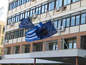 Vergina Sun flag at the Kozani Prefecture, along with the European flag and the flag of Greece.