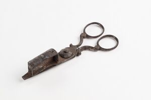 Candle snuffers are instruments used to extinguish burning candles by smothering the flame with a small metal cup that is suspended from a long handle, and thus depriving it of oxygen. An older meaning refers to a scissor-like tool used to trim the wick of a candle. With skill, this could be done without extinguishing the flame. The instrument now known as a candle snuffer was formerly called an "extinguisher" or "douter".