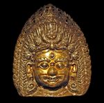 The earliest iconic artworks of Shiva may be from Gandhara and northwest parts of ancient India. There is some uncertainty as the artwork that has survived is damaged and they show some overlap with meditative Buddha-related artwork, but the presence of Shiva's trident and phallic symbolism[note 2] in this art suggests it was likely Shiva.[126] Numismatics research suggests that numerous coins of the ancient Kushan Empire (30–375 CE) that have survived, were images of a god who is probably Shiva.[127] The Shiva in Kushan coins is referred to as Oesho of unclear etymology and origins, but the simultaneous presence of Indra and Shiva in the Kushan era artwork suggest that they were revered deities by the start of the Kushan Empire.[128][129]
