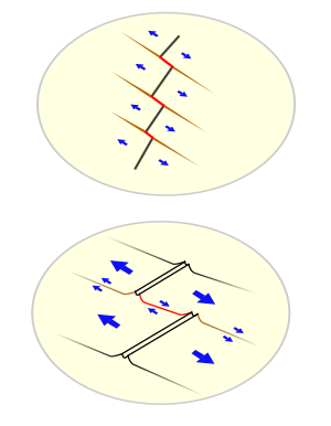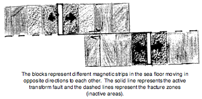 Geophysicist and geologist John Tuzo Wilson recognized that the offsets of oceanic ridges by faults do not follow the classical pattern of an offset fence or geological marker in Reid's rebound theory of faulting,[4] from which the sense of slip is derived. The new class of faults,[5] called transform faults, produce slip in the opposite direction from what one would surmise from the standard interpretation of an offset geological feature. Slip along transform faults does not increase the distance between the ridges it separates; the distance remains constant in earthquakes because the ridges are spreading centers. This hypothesis was confirmed in a study of the fault plane solutions that showed the slip on transform faults points in the opposite direction than classical interpretation would suggest.[6]