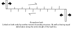 A transform fault or transform boundary, is a fault along a plate boundary where the motion is predominantly horizontal.[1] It ends abruptly where it connects to another plate boundary, either another transform, a spreading ridge, or a subduction zone.[2] A transform fault is a special case of a strike-slip fault that also forms a plate boundary.