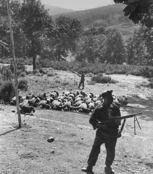 | ما رواه جابر؛ قال :"شهدت مع رسول الله صلى الله عليه وسلم صلاة الخوف، فصففنا صفين والعدو بيننا وبين القبلة، فكبر رسول الله صلى الله عليه وسلم فكبرنا، ثم ركع وركعنا جميعا، ثم رفع رأسه من الركوع ورفعنا جميعا، ثم انحدر بالسجود والصف الذي يليه، وقام الصف المؤخر في نحر العدو، فلما قضى النبي صلى الله عليه وسلم السجود، وقام الصف الذي يليه؛ انحدر الصف المؤخر بالسجود، وقاموا، ثم تقدم الركوع ورفعنا جميعا، ثم انحدر بالسجود والصف الذي يليه وكان مؤخرا في الركعة الأولى، وقام الصف المؤخر في نحر العدو، فلما قضى صلى الله عليه وسلم السجود، وقام الصف الذي يليه؛ انحدر الصف المؤخر بالسجود، فسجدوا، ثم سلم صلى الله عليه وسلم وسلمنا جميعا".(رواه مسلم في صحيح مسلم) —حديث نبوي [10] |
