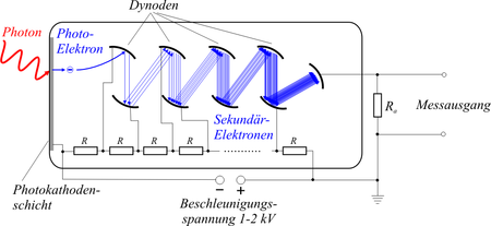 التركيب الداخلي: يسقط الفوتون الملون بالأحمر على المهبط الضوئي فيحرر إلكترونا بناء على الظاهرة الكهروضوئية, يتولى الجهد الكهربي المسلط على القطب الكهربائي المعدني (الداينود) الأول تعجيل الإلكترون, فيتعرض لسلسلة من الارتدادات يحرر في خضمها مجموعة من الإلكترونات بناء على ظاهرة الانبعاث الثانوي, ما ينجم في النهاية عن حزمة ضوئية (باللون الأزرق), هي في ذاتها ليست إلا صورة مكبرة عن ذلك الفوتون الأحمر