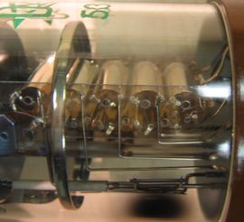 صمام تضخيم ضوئي، بطول حوالي 17 سم؛ إلى اليسار نافذة الدخول بمهبط ضوئي في الوسط مربوط مع دينودات عوازل.