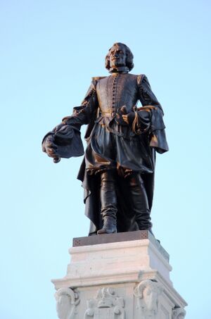 Statue of Samuel de Champlain at sunrise (looking to the north-west; with a similar expressive face as traditionally Jacques Cartier's), by Paul-Romain Marie Léonce Chevré (fr) (Paris, 1896–1898), as newly repaired for 2008, at Quebec City since 1898, near Château Frontenac grand hotel, on the Terrasse Dufferin.