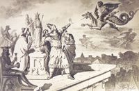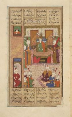 اجتمع ملوك الفرس الى باب الضحاك، و أذعنوا له بالطاعة. فقدم أرضهم، و جلس على تخت السلطنة، و وضع على رأسه تاج الملك، و جمع عساكر البر و البحر ثم ملك الضحاك، و عم ملكه طلاع الأرض شرقا و غربا، و برا و بحرا. الشاهنامه 8:23