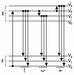 ومن المعروف أن في كل ذرةٍ سويات مختلفة للإثارة تقابل الطبقات الإلكترونية المختلفة في الذرة. وفي كل انتقال من سويةٍ إلى سوية أدنى يصدر إشعاع وحيد اللون، (انظر الشكل 3). أما في الجزيء، فإن الانتقال من حالةٍ مثارة إلى السوية الدنيا الأساسية، يولّد عدداً غير منته من العصائب الطيفية، ذلك لأنه يضاف في هذه الحالة إلى تغيرات الطاقة في الذرات التغيراتُ المكمّمة quantised لطاقة النوى المهتزة حول وضع توازنها من جهة، وتغيرات طاقة دوران الجزيء من جهة أخرى.