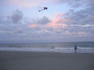 A man flying a kite on the beach, a good location for flying as winds travelling across the sea contain few up or down draughts which cause kites to fly erratically.