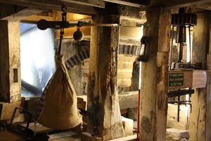 Model of a Roman water-powered grain-mill described by Vitruvius. The millstone (upper floor) is powered by a undershot waterwheel by the way of a gear mechanism (lower floor)