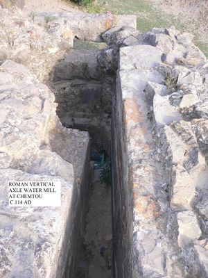 Roman turbine mill at Chemtou, Tunisia. The tangential water inflow of the millrace made the horizontal wheel in the shaft turn like a true turbine, the earliest known.[2]