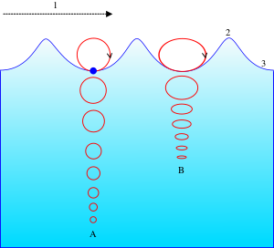 A = At deep water. The circular motion magnitude of fluid particles decreases exponentially with increasing depth below the surface.